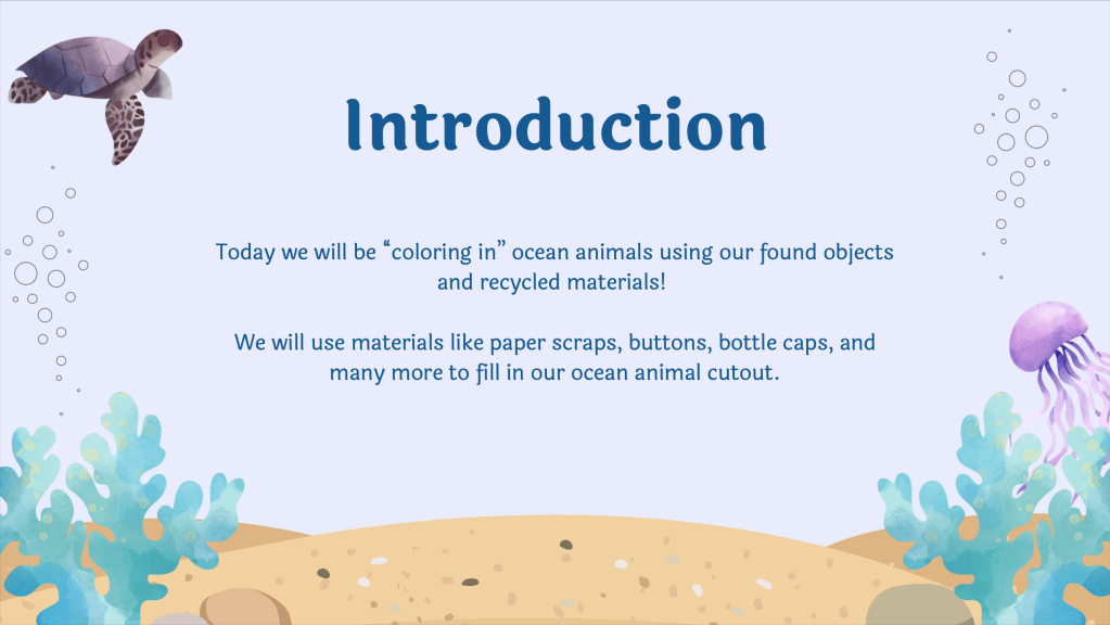 Demonstration: Students will get an introduction to the project through a Canva Presentation, including a brief lesson overview, directions, and a teacher sample to help guide students how possible materials could be used. There will be steps presented on how to fill the ocean animal outline by showing methods of layering and filling out the outline.