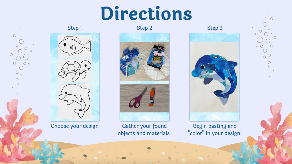 The materials as well as the ocean animal cutouts will be provided on tables for students to choose from, and directions will be given both visually and orally. Students will be encouraged to think outside of the box with the use of different colors and textures while repurposing materials to create their new piece of artwork.